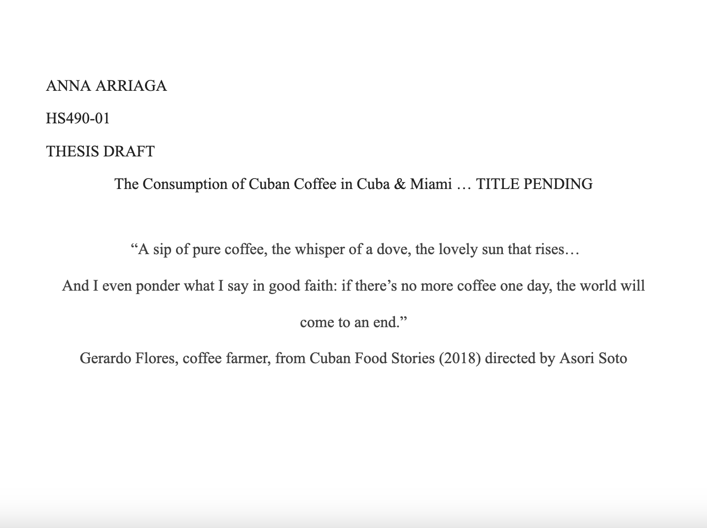 I am currently working on an extensive thesis research paper on the topic of Cuban coffee. Through a series of interviews I conducted in my hometown of Miami, I will be defining Cuban coffee as a food tradition. This is meant to turn into a bigger project past my graduation in May 2024.